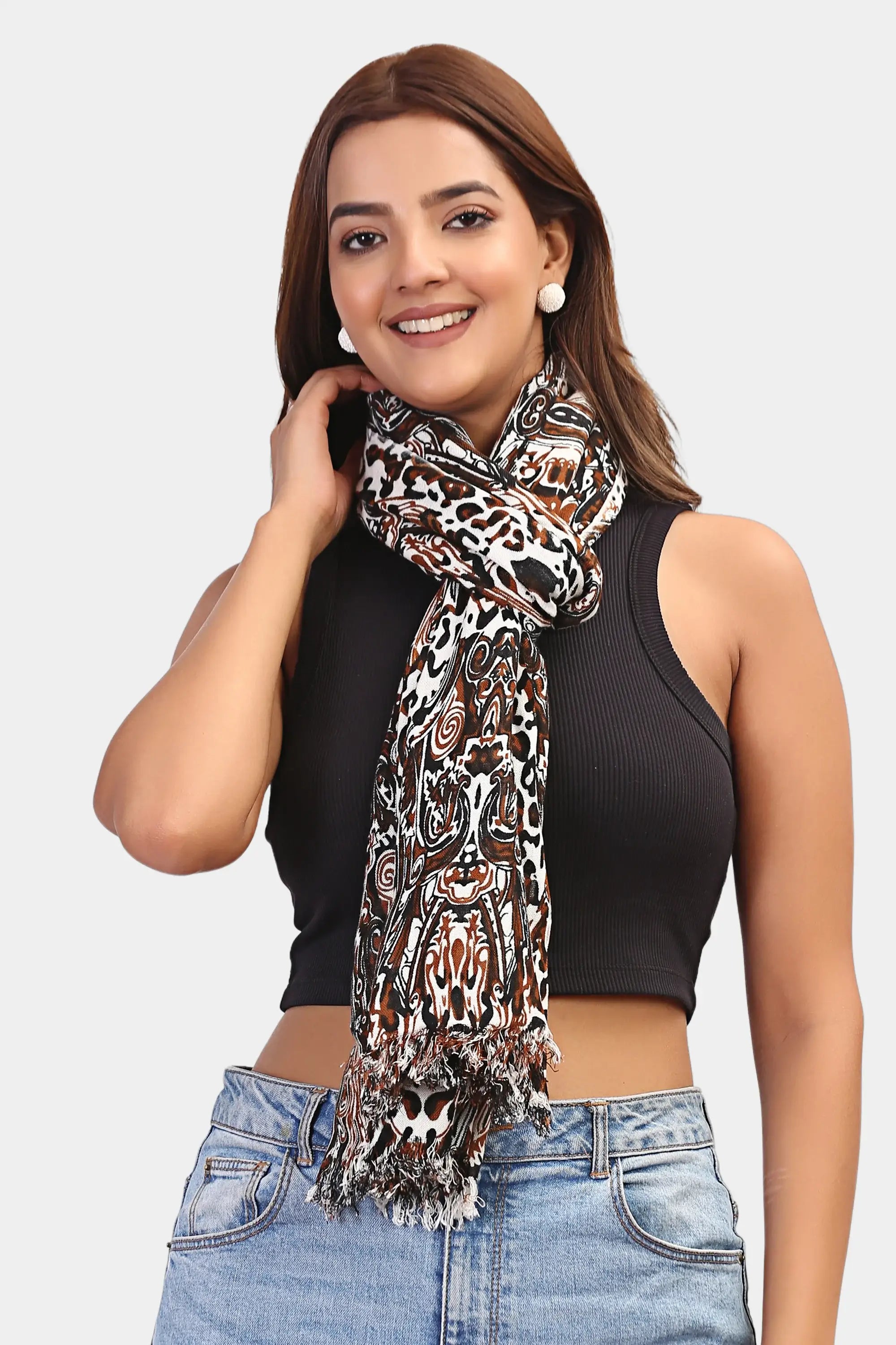 • Leopard print scarf brings a touch of wild elegance.